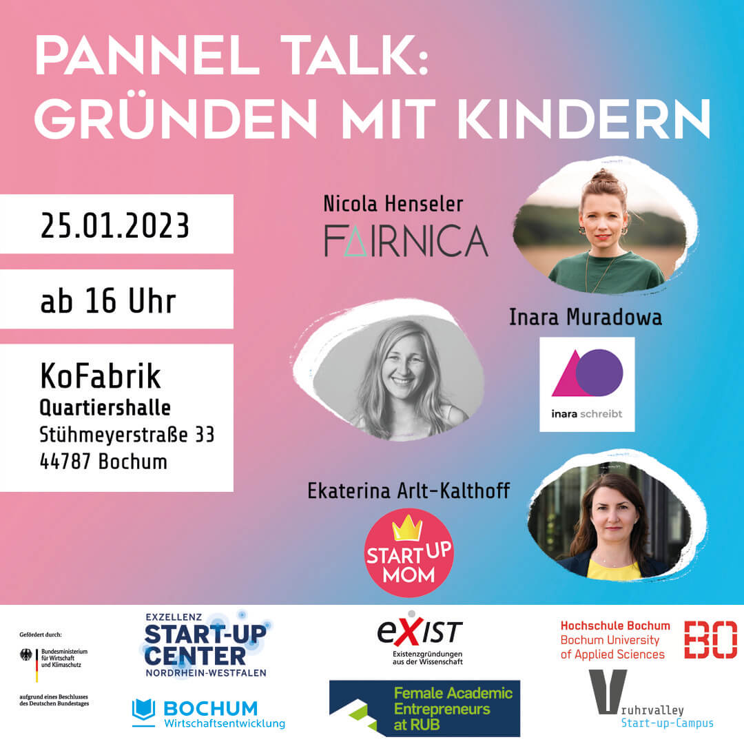 Über Hürden, Freuden, Alltag, Fragen und Lösungsversuche u.v.m. sprechen wir beim Pannel Talk mit Nicola Henseler, der Gründerin von FAIRNICA, Ekaterina Arlt-Kalthoff, Gründerin von MOM Accelerator und Inara Muradowa, Gründerin von Inara schreibt, und weiteren Unternehmer*innen, die Eltern sind. Veranstaltet wird das Event in Kooperation mit der Bochumer Wirtschaftsentwicklung, der HS Bochum und dem ruhrvalley Start-up-Campus.