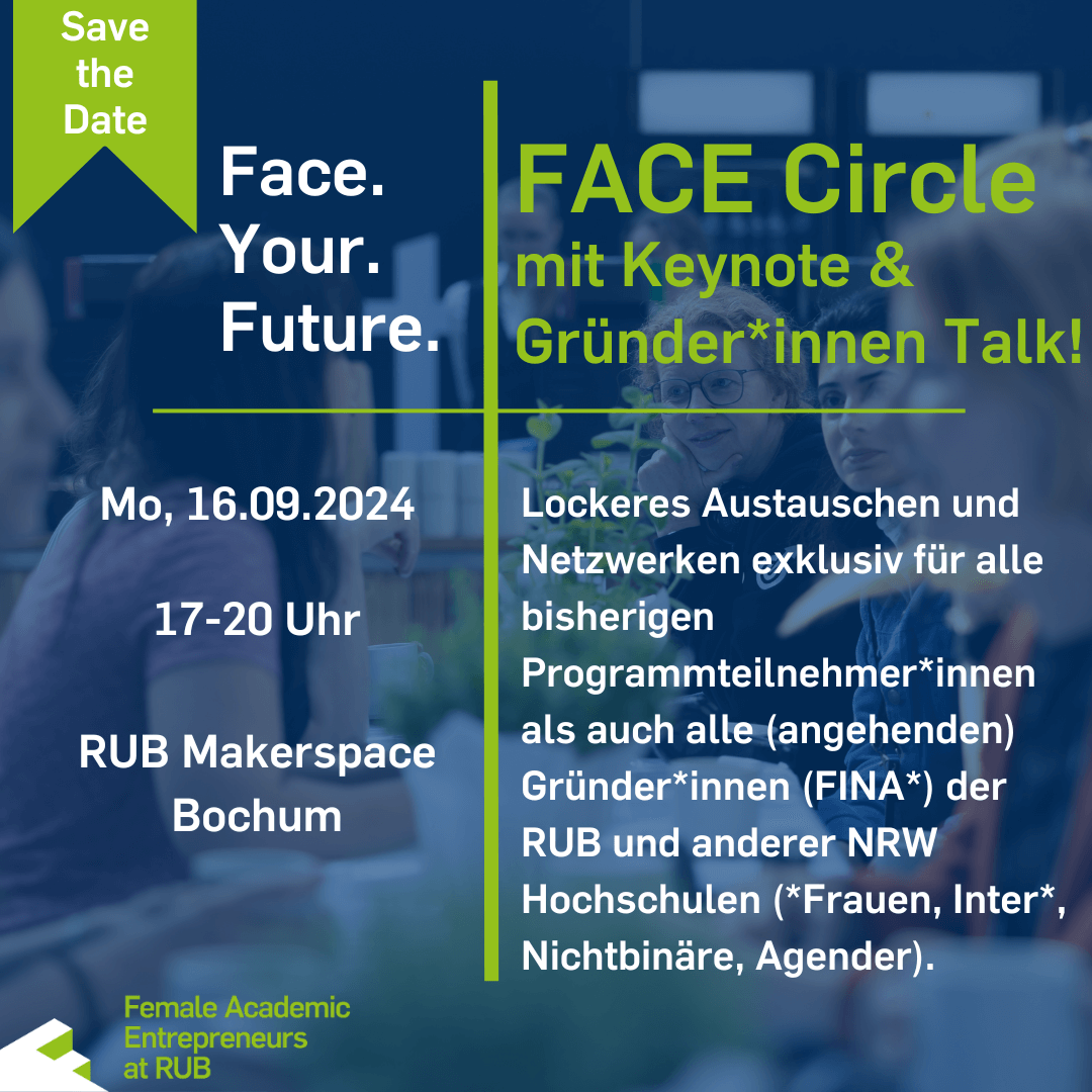RUB-Makerspace Suttner-Nobel-Allee 4, BochumSAVE THE DATE Gemeinsam.Erfolgreich.Wachsen Unter diesem Motto fand zum dritten Mal der FACE Xelerator statt. Mit unserem Xelerator-Programm unterstützen wir Gründerinnen und Gründerinnen in gemischten Teams aus ganz NRW bei der Weiterentwicklung und Umsetzung ihrer Gründungsvorhaben. Im Rahmen des FACE Xelerator Pitch Days präsentieren sich die diesjährigen Teilnehmerinnen auf der Bühne im RUB Makerspace. Dazu […]